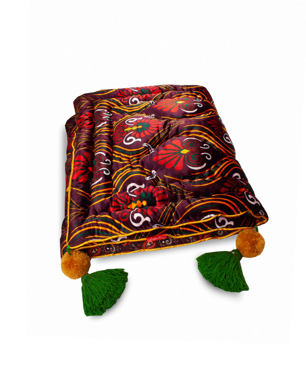 Geleneksel Özbek kadifesi ve pamuklu kumaşlarıyla üretilir. Her biri elde dikilir, içi doğal yünle doldurulur ve ustaların elinde geleneksel sırıma yöntemiyle tamamlanır.